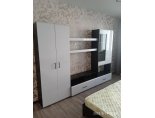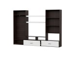 Тумба состоит из секции с двумя выдвижными ящиками, открытой ниши шириной 1200 мм, разделенной пополам вертикальной перегородкой и надстройкой. Надстройка в свою очередь состоит из секции со створками (правая глухая, левая со стеклом) и открытой ниши (ШхВхГ) 768х387х330 мм. В секции со створками устанавливаются две съемных полки. Шкаф с левой стороны комплектуется двумя распашными створками. В шкафу устанавливаются две стационарных полки, сверху и снизу и выдвижная евроштанга. Между шкафом и надстройкой располагаются две полки 1200х250 мм с фасадами из МДФ «Белый глянец».