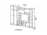 Имеет большое количество открытых и закрытых полок, два выдвижных ящика снизу, пенал с антресольной полкой и штангой для вешалок.