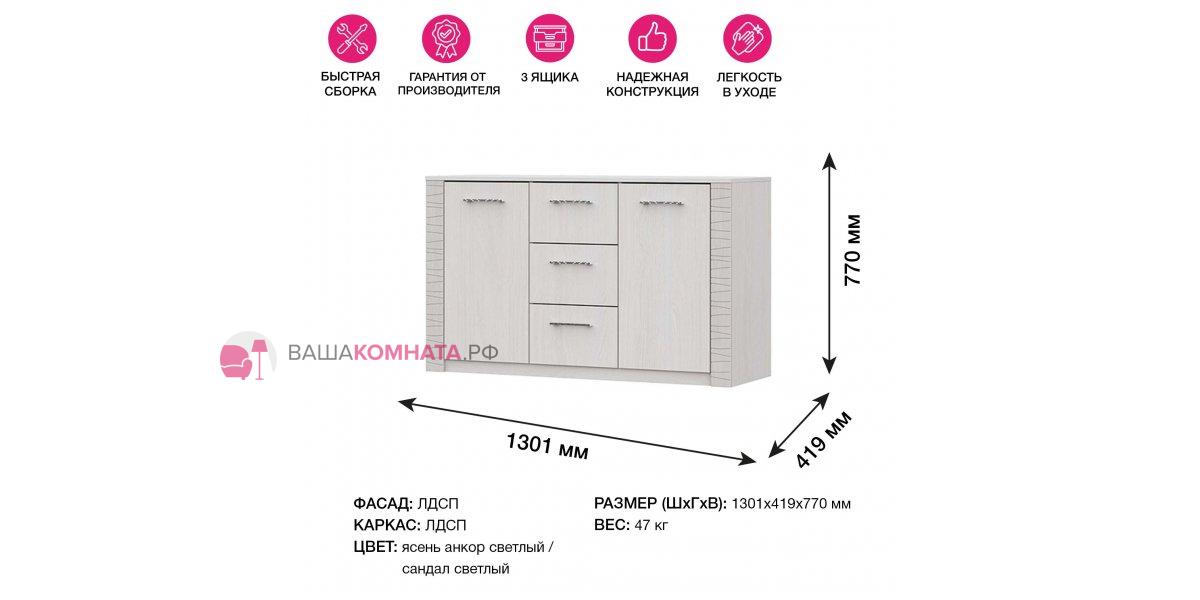 Комод 3 ящика двустворчатый "Гамма 20" серия 4 - Ясень анкор светлый / Сандал светлый