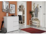 Комод состоит из 3‑х выдвижных ящиков на шариковых направляющих, полезным габаритом Д.323хВ.138хГ.368мм. с правой стороны, и распашной створкой с левой стороны, за которой находится отделение с полкой. Предусмотренный между фасадами ящика зазор в 30мм., а также утопленные вглубь корпуса декоративные планки, позволяют удобно браться за фасад при его открывании.