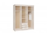 Двери с левой и с правой стороны декорированы зеркалами с фацетом. Средняя секция представляет собой закрытый стеллаж с множеством отделений: две распашные двери, за которыми находятся съемные нерегулируемые по высоте полки, внизу три выдвижных ящика на роликовых направляющих. Шкаф-купе выполнен из ЛДСП толщиной 16 мм. Ручки изготовлены из пластика и металла. Пластиковые боковые части затонированы под хром, а центральная часть состоит из матового металла. Задняя стенка и дно выдвижных ящиков - из неокрашенного ДВПО (оргалит). Запил под плинтус у данной модели мебели отсутствует. Шкаф выполнен из качественных материалов, что позволит ему прослужить Вам долгие годы.