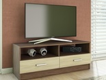 Функциональная тумба под телевизор состоит из широкой подставки для монитора, двух вместительных выдвижных ящичков и полочек, которые смогут разместить необходимые детали интерьера.